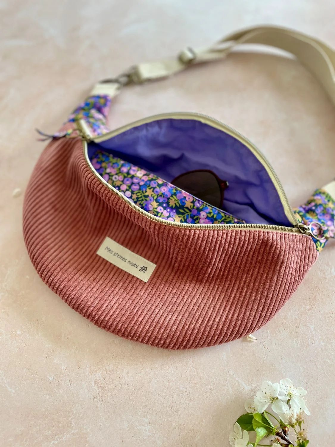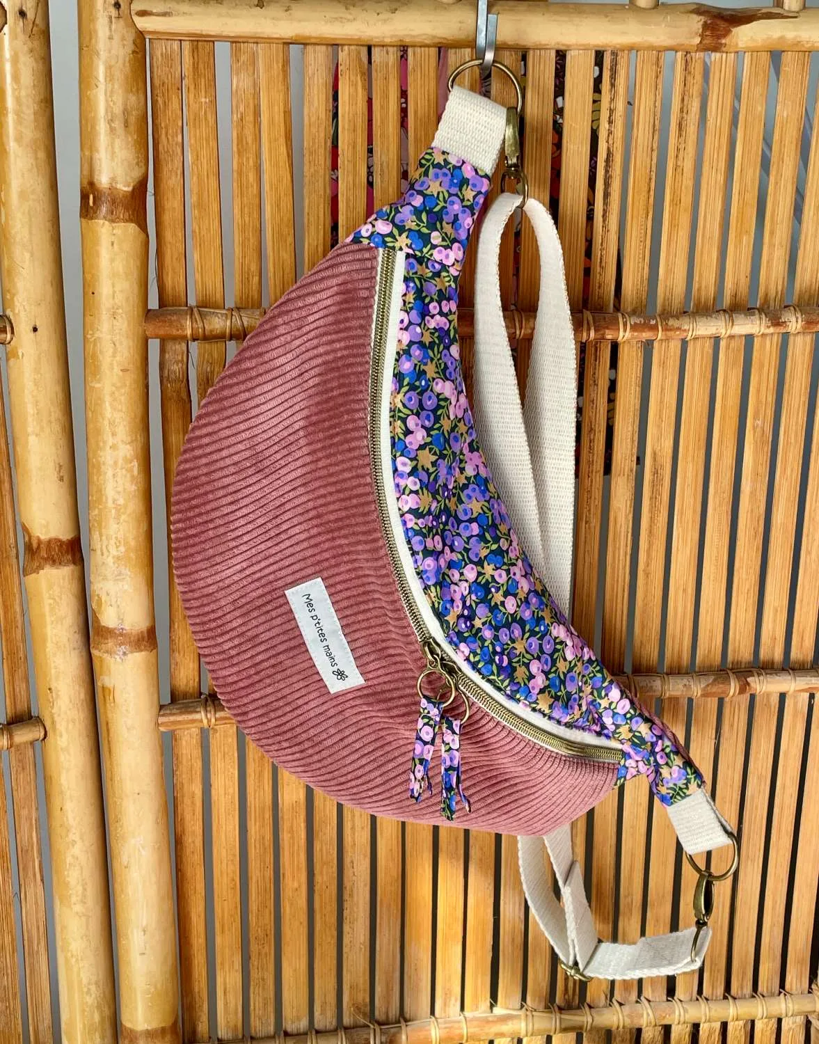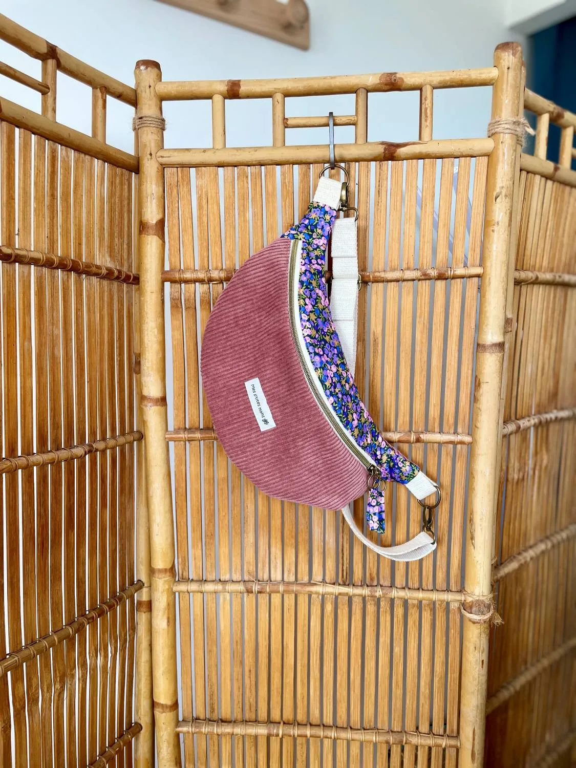 Cette banane est réalisée dans un velours côtelé couleur rose et un tissu Liberty pois de senteur dans les tons de violet, rehaussé d’étoiles dorées. Elle est entièrement doublée et munie d’une poche intérieure en Liberty assorti pour ne plus perdre ses affaires au fond de son sac!