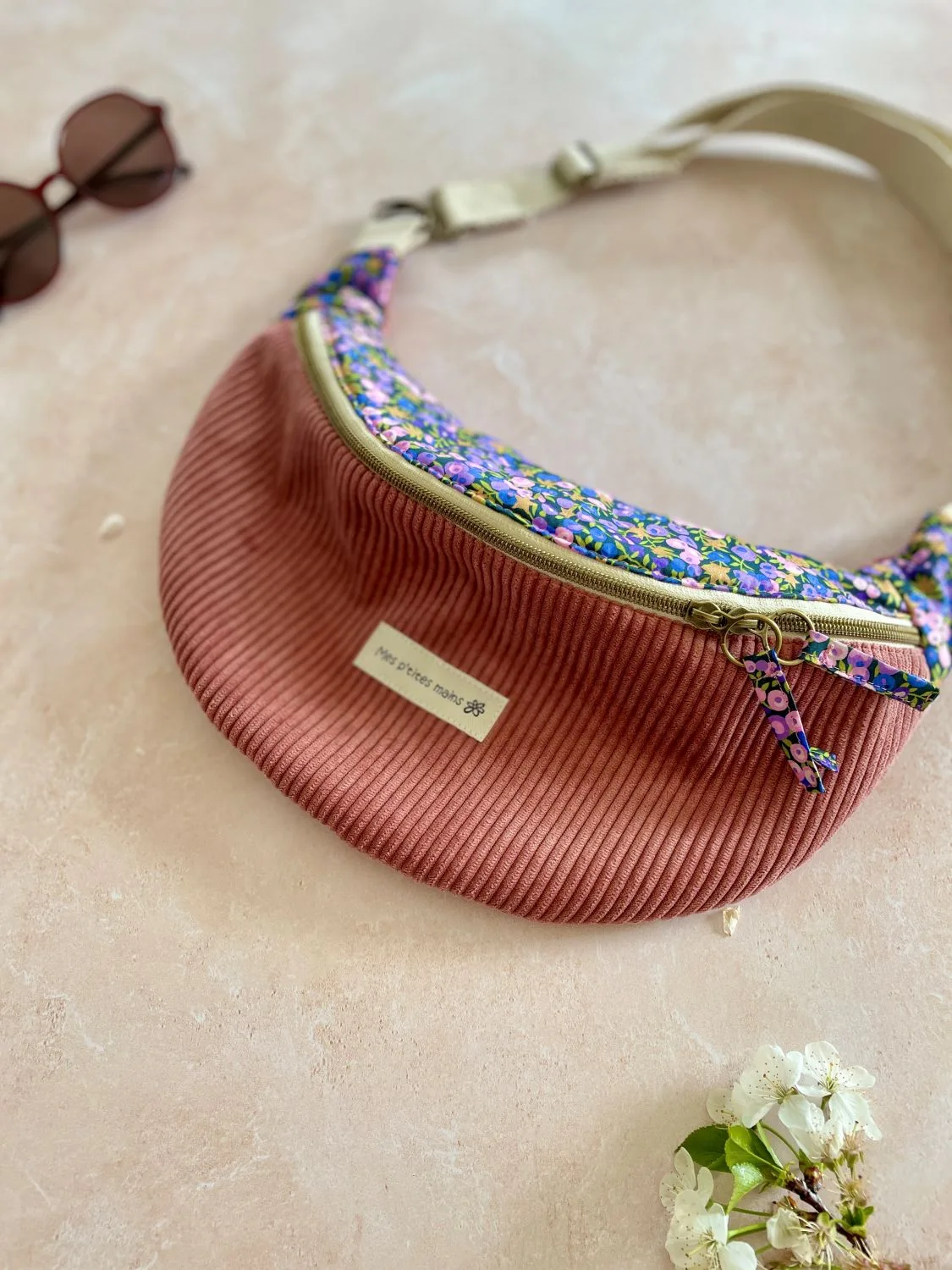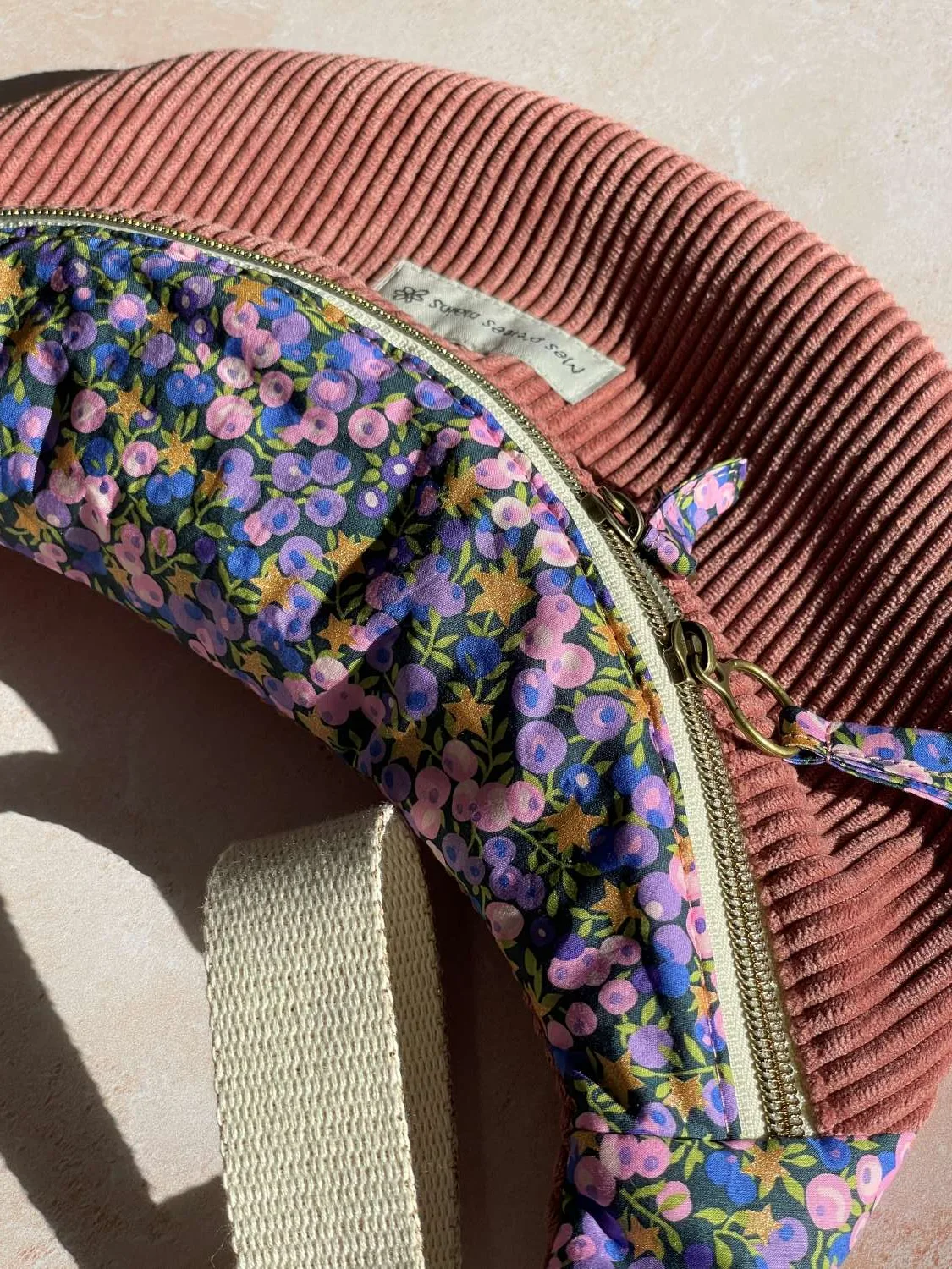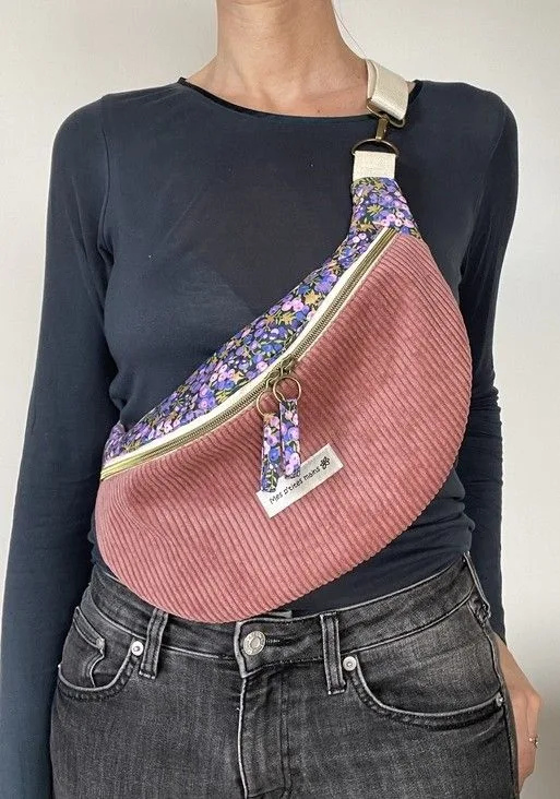Cette banane est réalisée dans un velours côtelé couleur rose et un tissu Liberty pois de senteur dans les tons de violet, rehaussé d’étoiles dorées. Elle est entièrement doublée et munie d’une poche intérieure en Liberty assorti pour ne plus perdre ses affaires au fond de son sac!