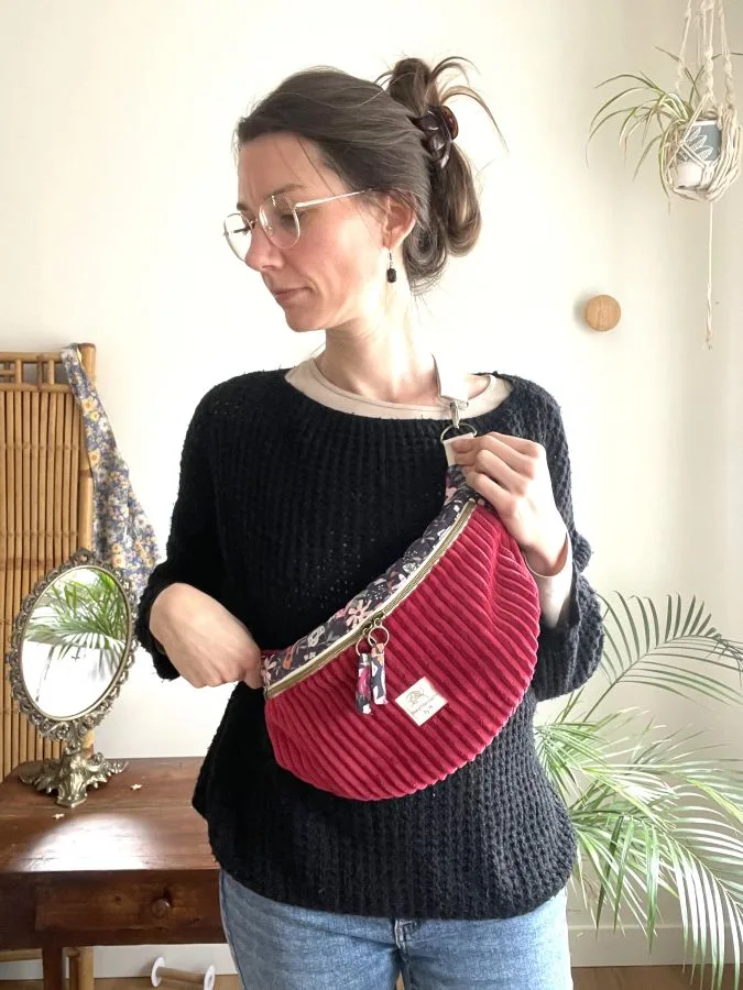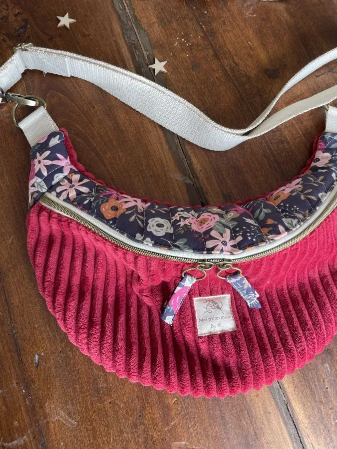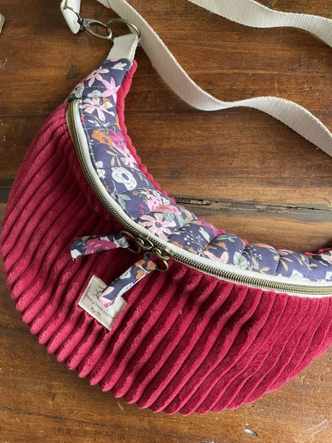 Une jolie banane fleurie réalisée en velours côtelé à grosses côtes lie de vin et coton fleuri Olga (matelassé en option) en grand format pour y ranger toutes vos affaires.