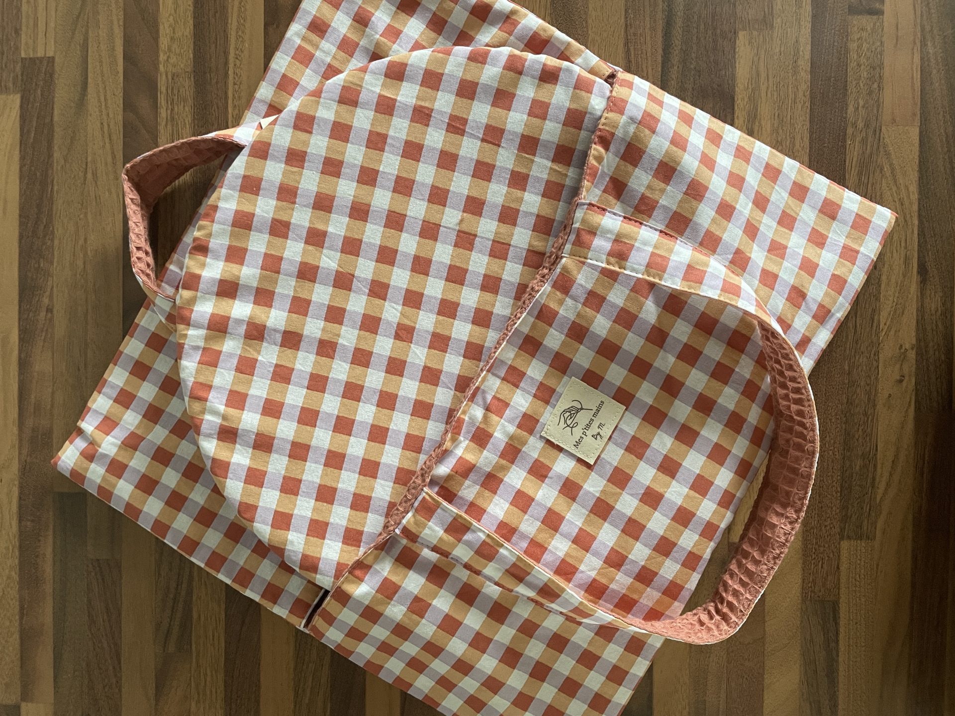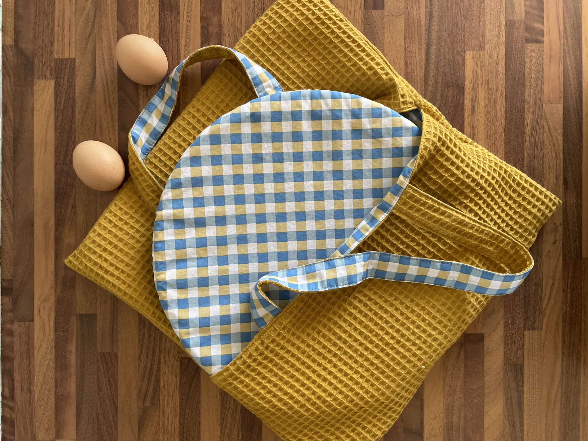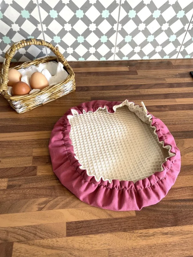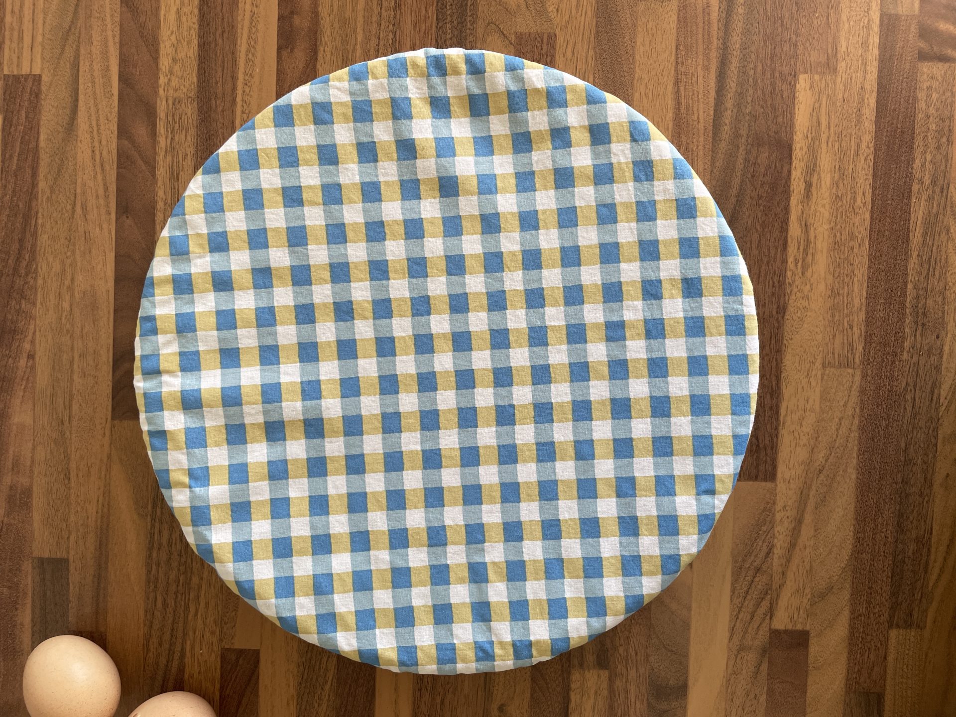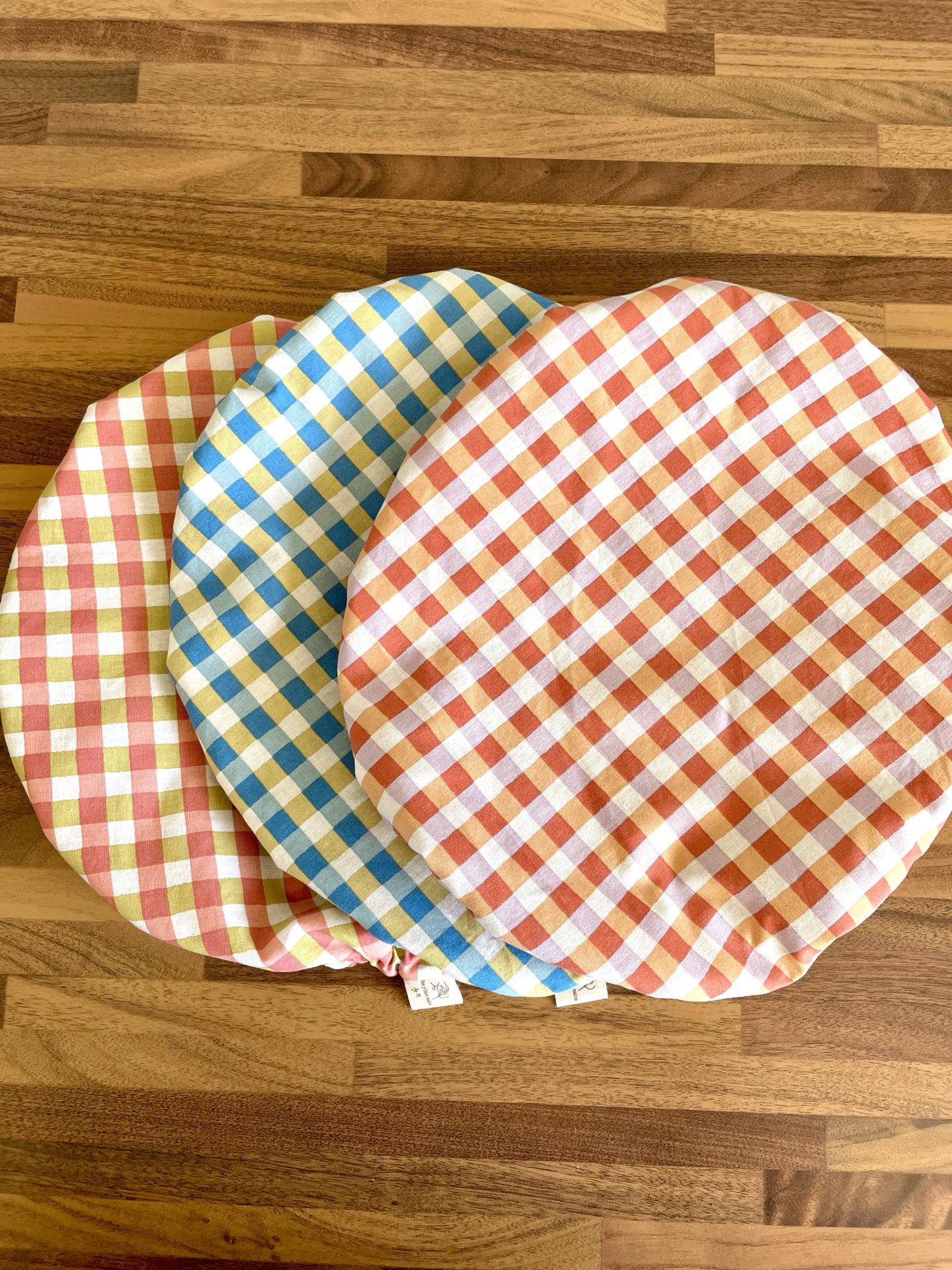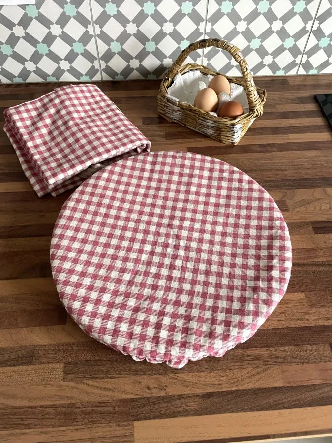 Cette charlotte couvre-plat est cousue dans un joli coton imprimé vichy bicolore et est disponible dans trois tailles et trois couleurs différentes. Elle est entièrement doublée et réversible. La seconde face est un nid d’abeille qui permet de lui conférer un côté absorbant.