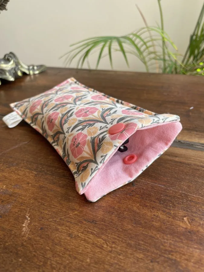 L’ouverture est facile avec un bouton pression en résine, et assez large car j’ai laissé un espace non cousu sur le haut pour pouvoir facilement attraper vos lunettes.