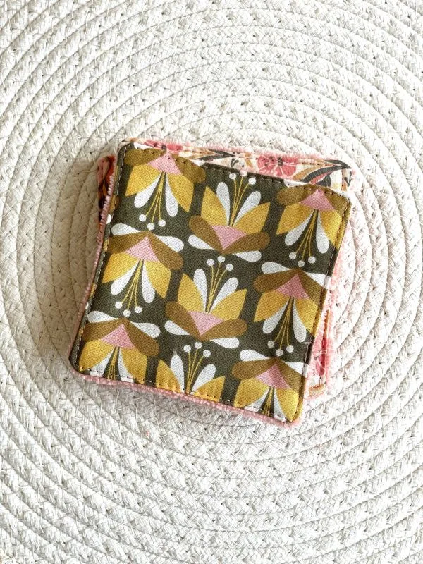 environ 10 cm x 10 cm, surpiquées sur tout le tour pour davantage de solidité et d’esthétique.