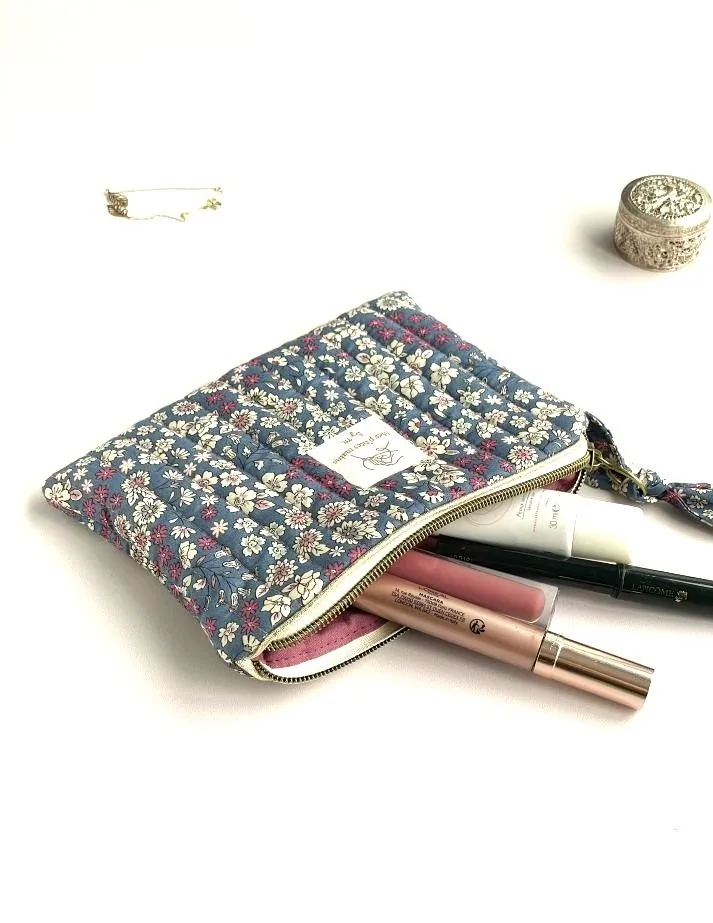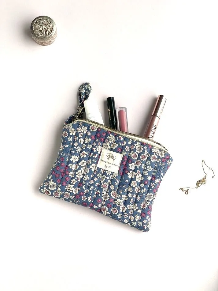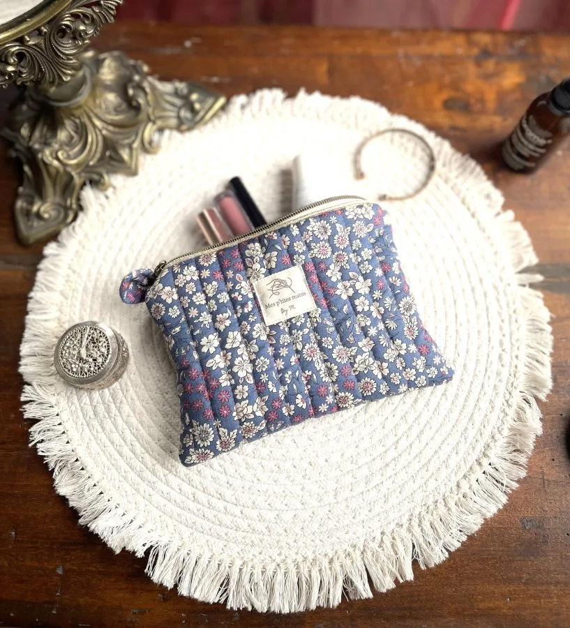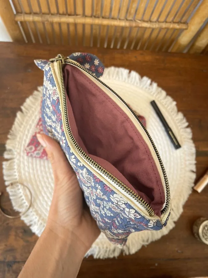 Une trousse matelassée à l’atelier, dans un tissu fin et délicat au joli motif fleuri. Une couleur incroyable entre le bleu et l’indigo. J’ai ajouté un joli liseré doré le long de la fermeture éclair pour apporter encore davantage de charme et de finesse à cette petite trousse.