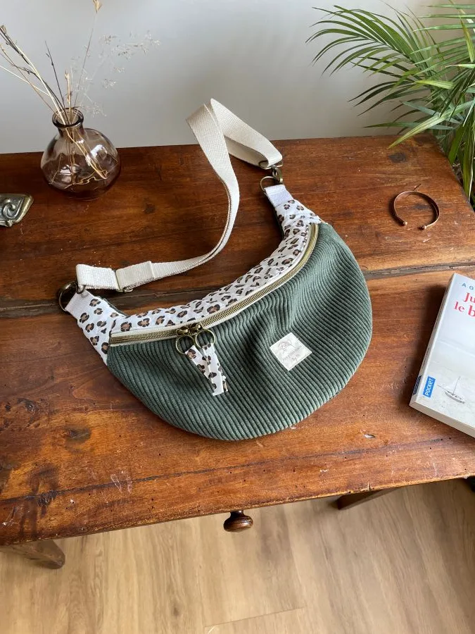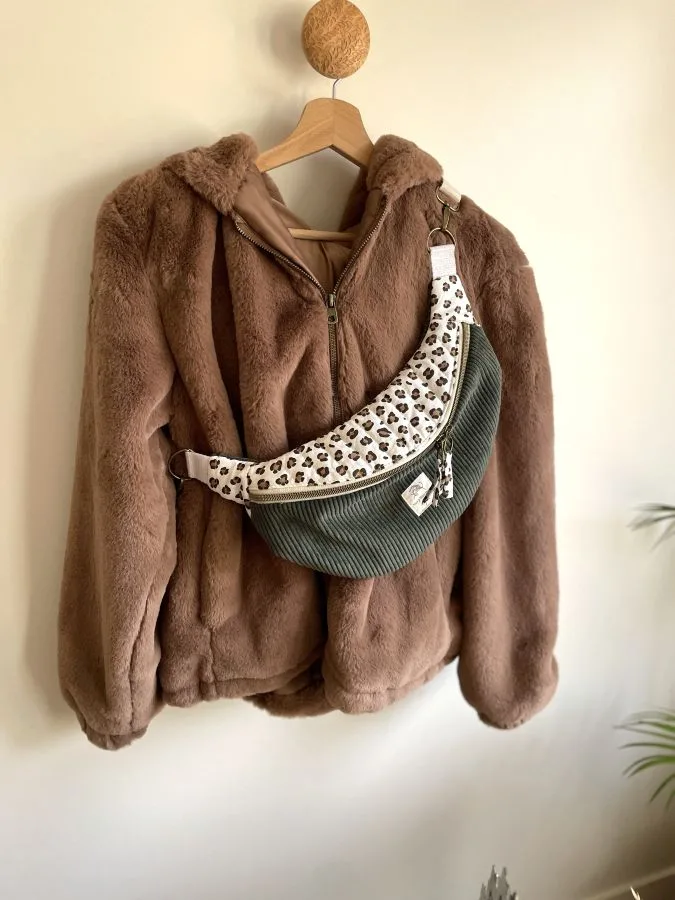 Découvrez ce joli sac banane en velours kaki pour femme dont la partie léopard est matelassée par mes soins à l’atelier.