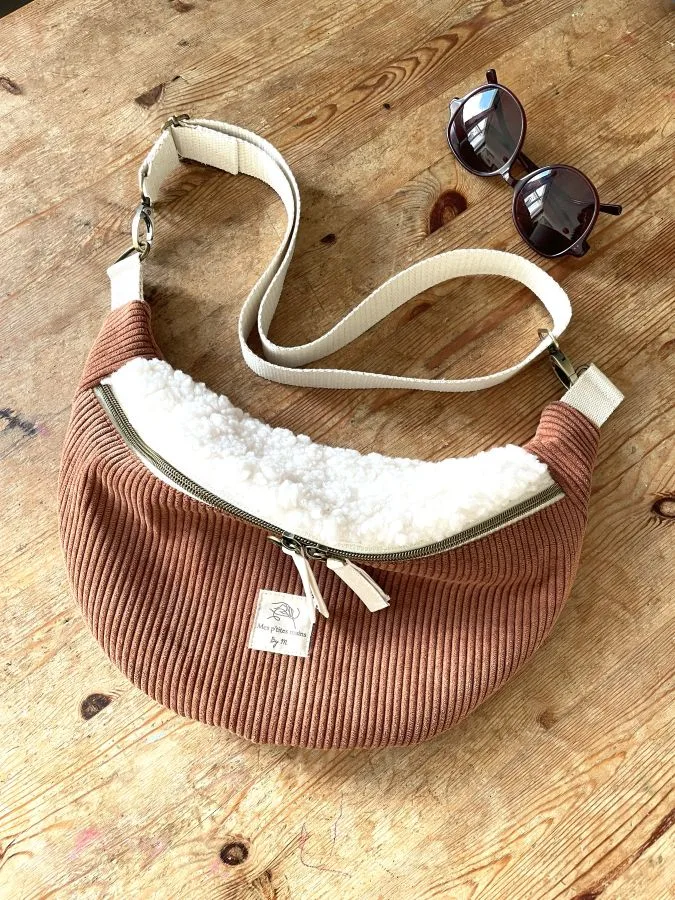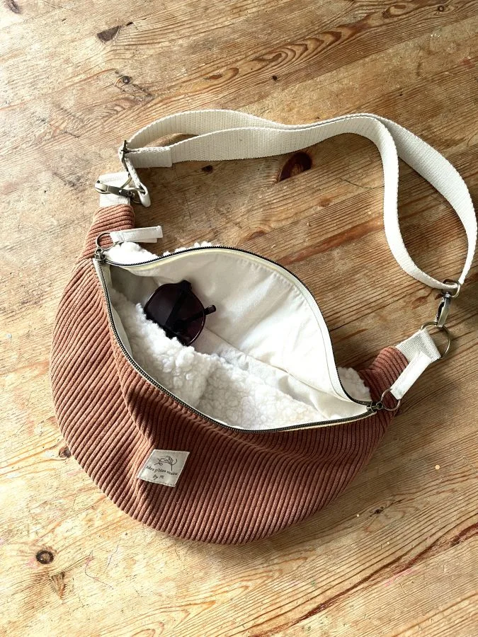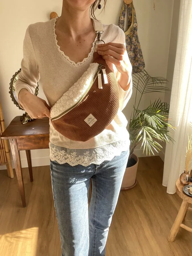 Un confortable sac banane fausse fourrure en sherpa et velours côtelé de couleur rouille (marron clair) comme on aime pour la saison cocooning.