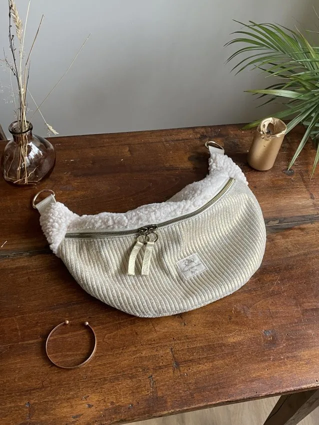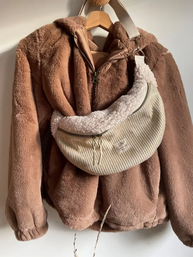 Un confortable sac banane fausse fourrure en moumoute et velours côtelé à personnaliser avec vos couleurs pour passer l’hiver tout en douceur.