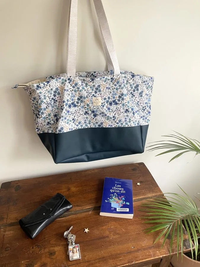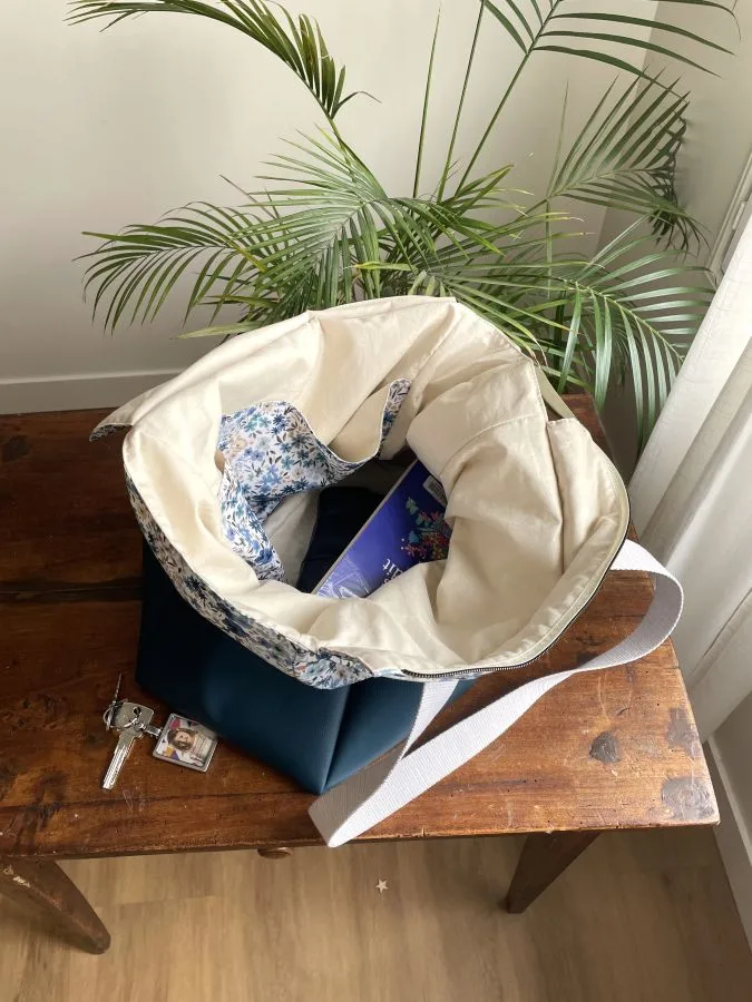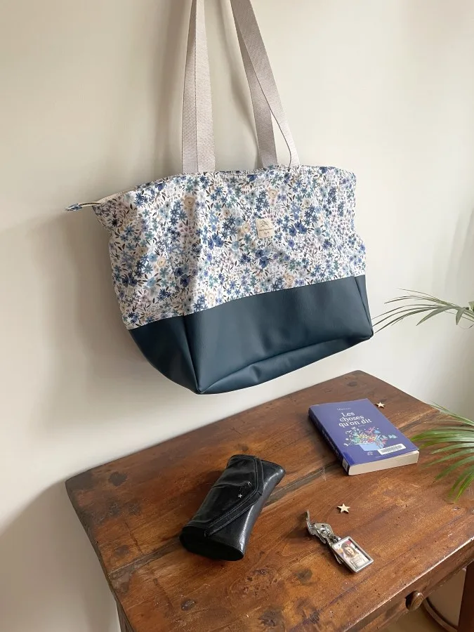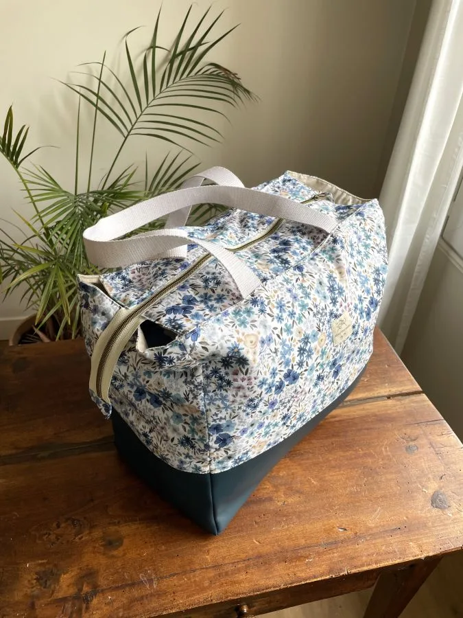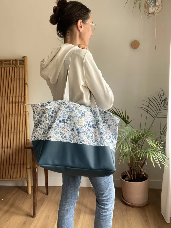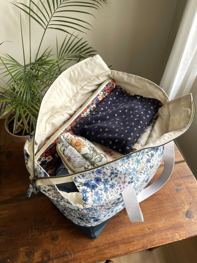 J’ai conçu ce modèle spécifiquement pour avoir un sac pratique dans lequel je peux ranger mes affaires pour 2/3 jours et les transporter facilement ! Depuis, je ne le quitte plus ! On peut facilement y mettre ses habits, ses affaires de toilettes, un livre, et même un ordinateur ou une tablette. C’est vraiment le format idéal pour voyager léger tout en emmenant ses essentiels.