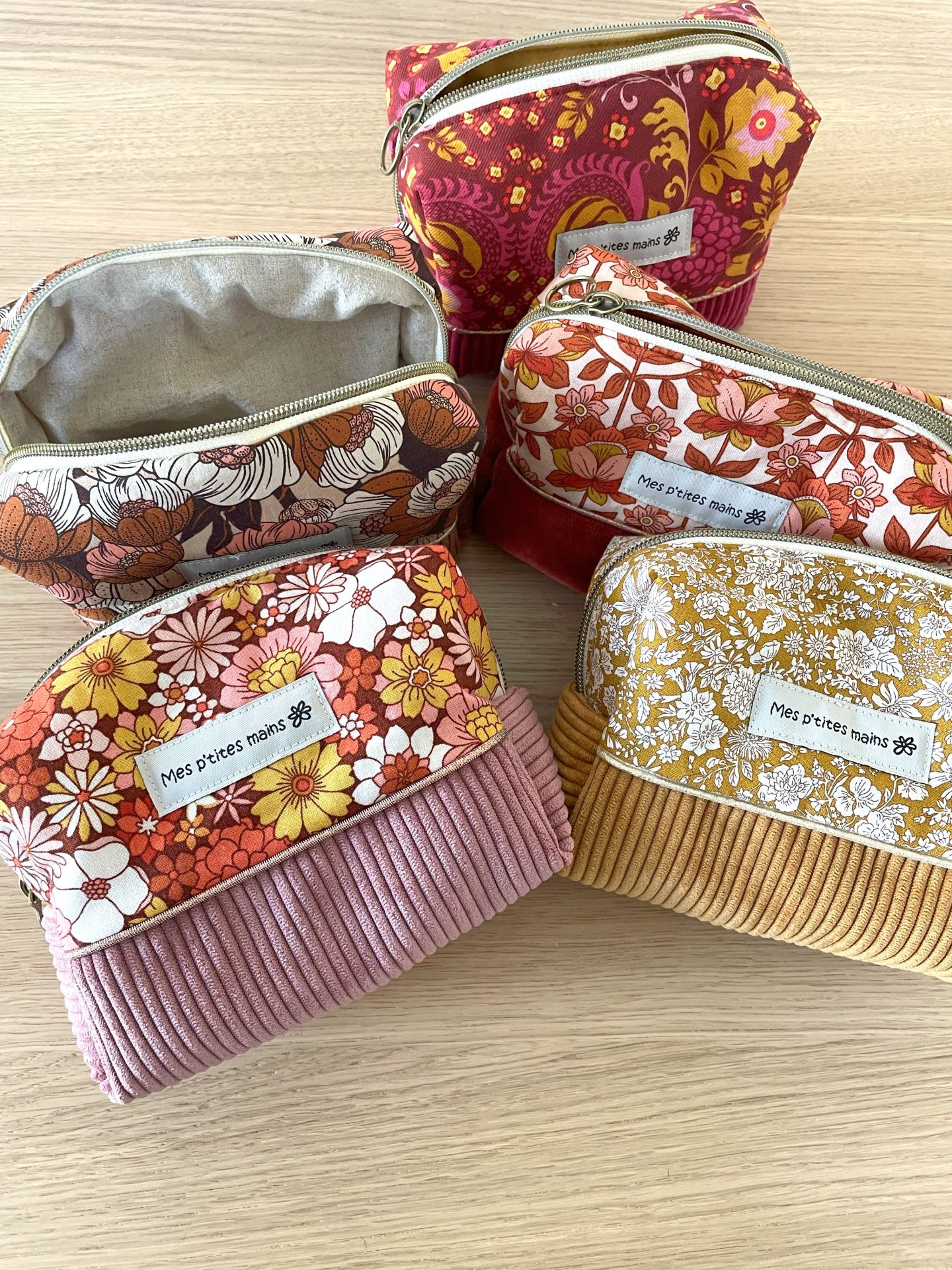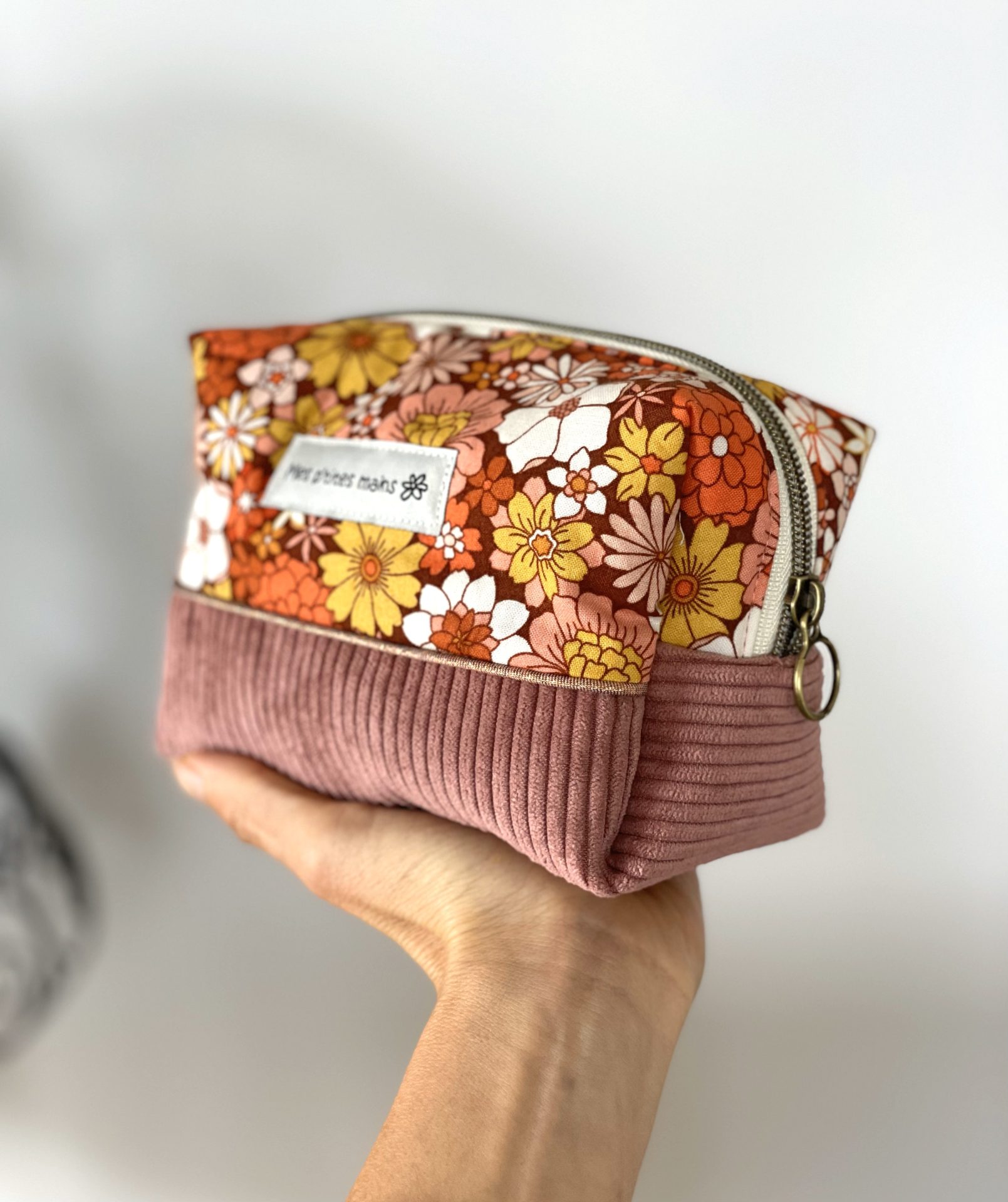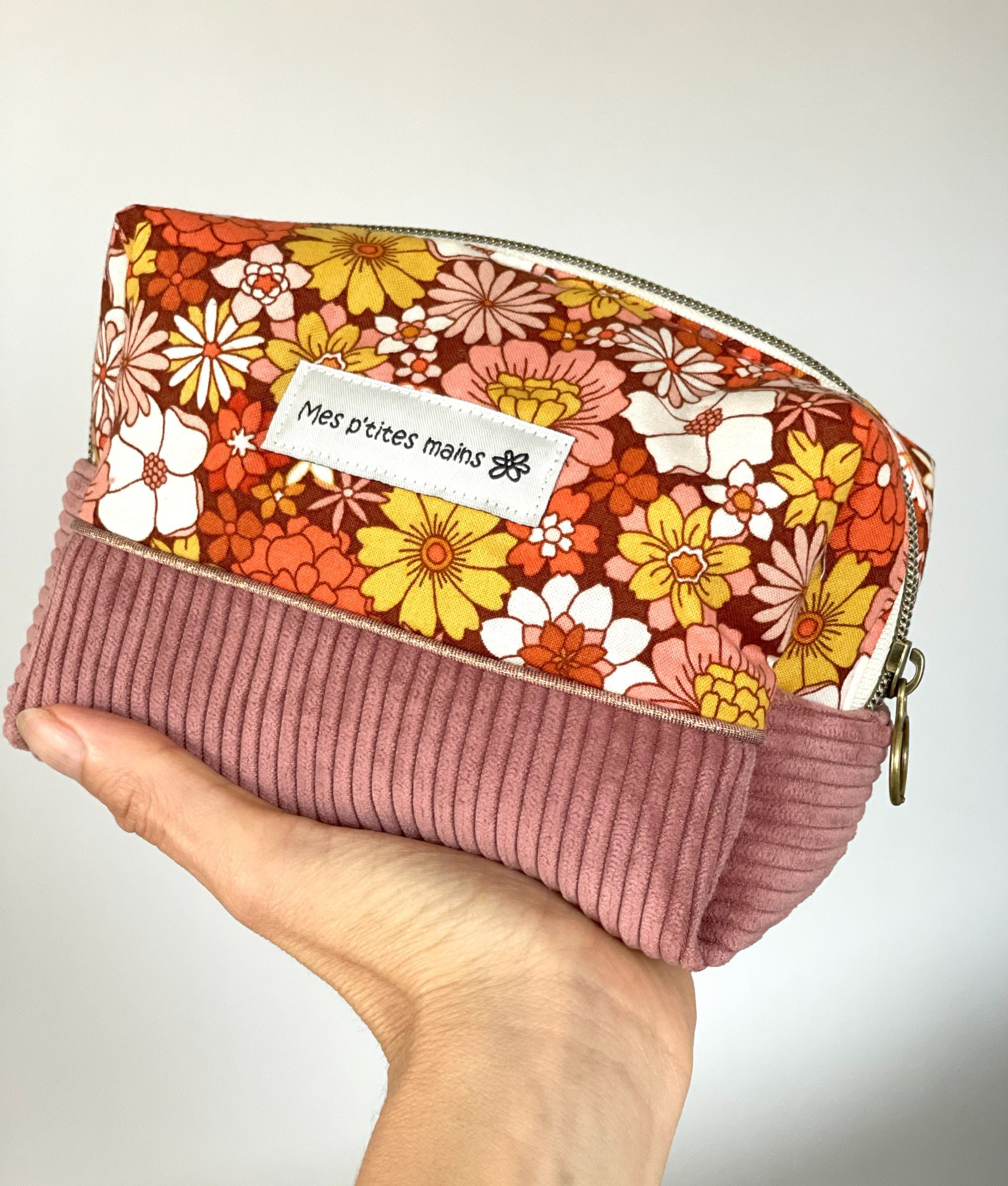 Une jolie trousse beauté femme réalisée dans un velours côtelé de couleur bois de rose et dans un coton assorti à l’imprimé fleuri.