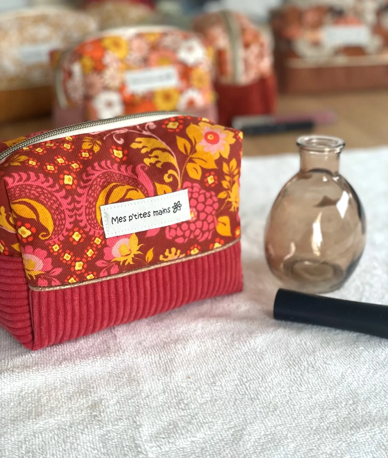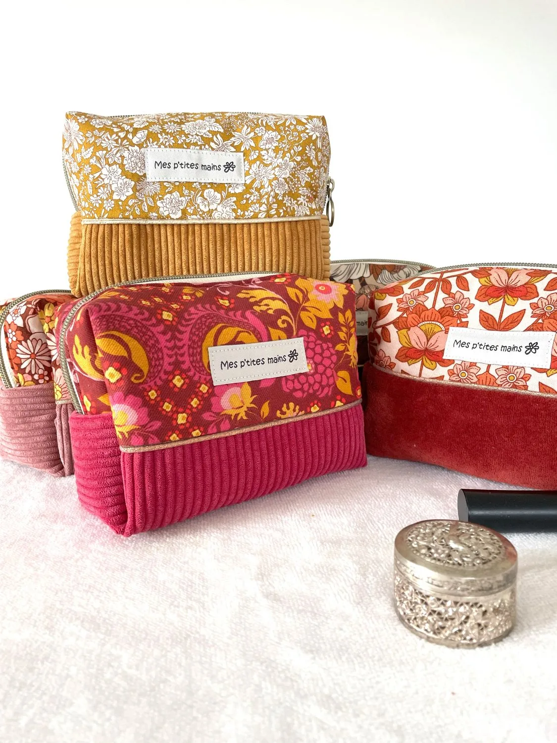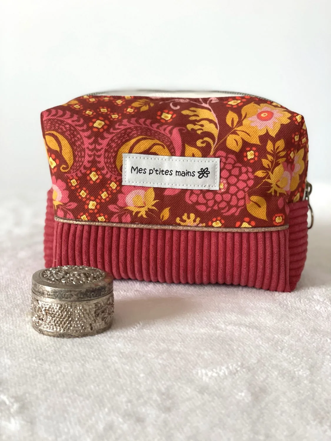 Une jolie petite trousse beauté réalisée dans un velours côtelé de couleur magenta et dans un coton assorti à l’imprimé fleuri.