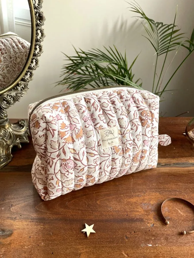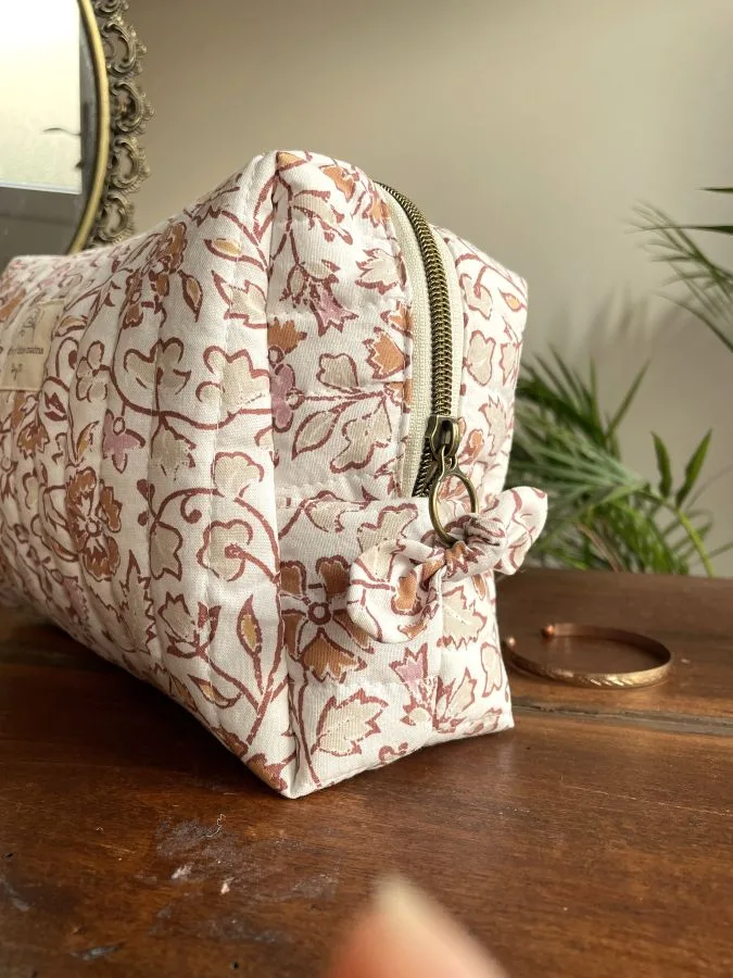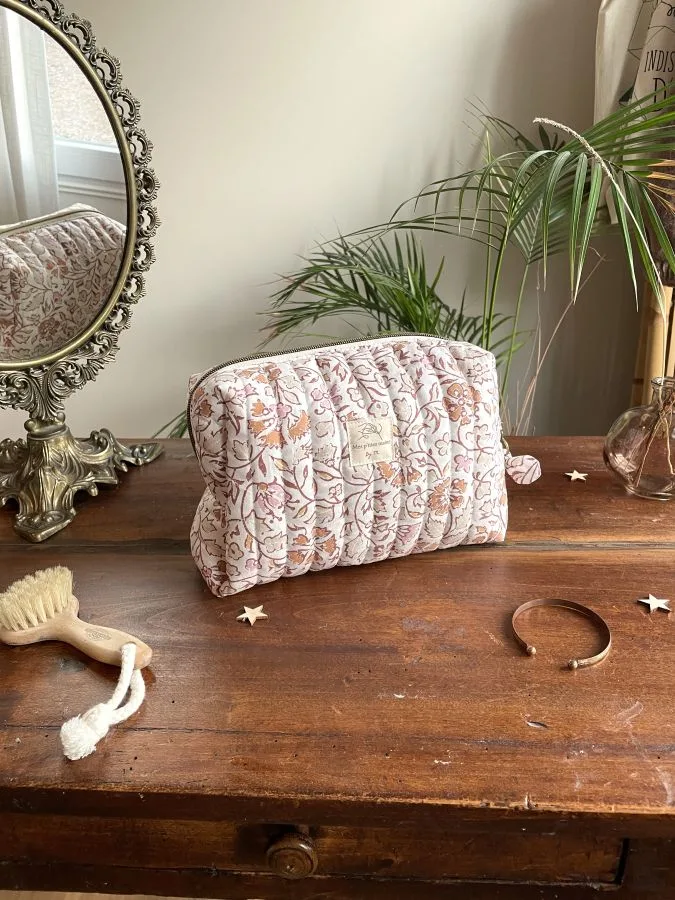 Découvrez cette jolie trousse de toilette matelassée à l’imprimé fleuri indien. Une trousse au grand format pour y transporter tous vos essentiels : produits de beauté, savons, brosse à dents, crèmes, etc.