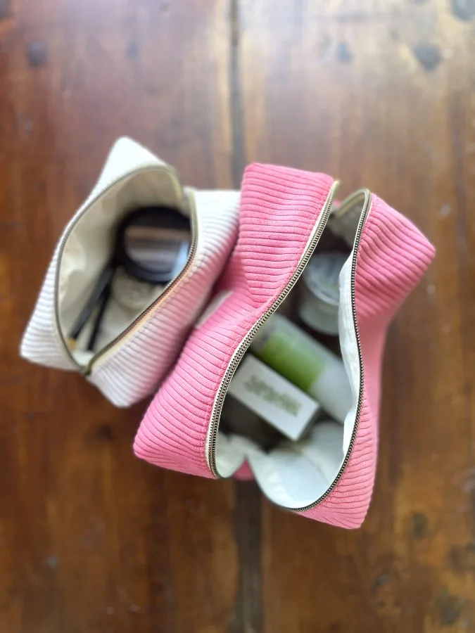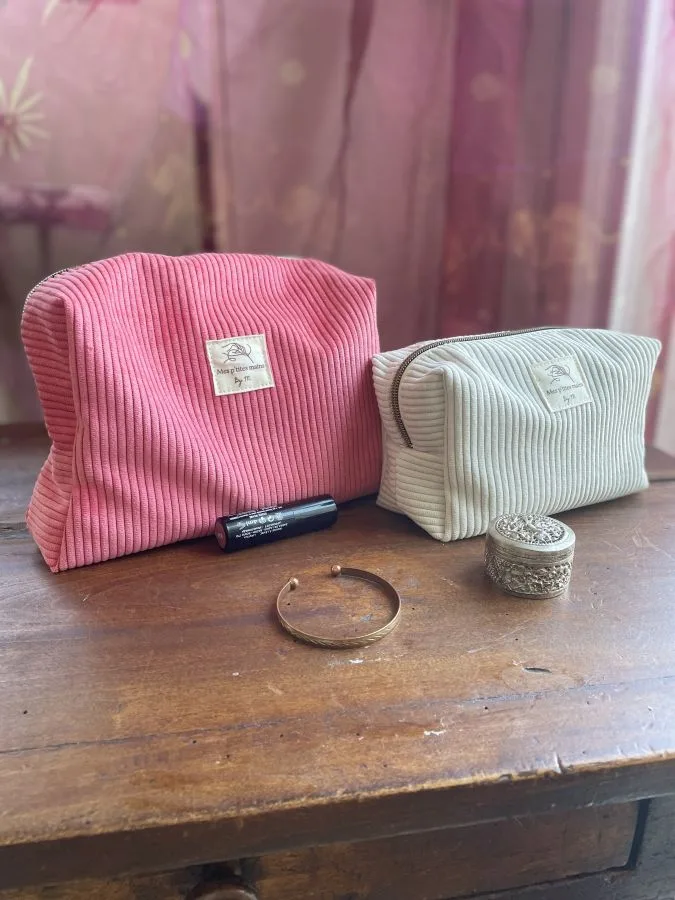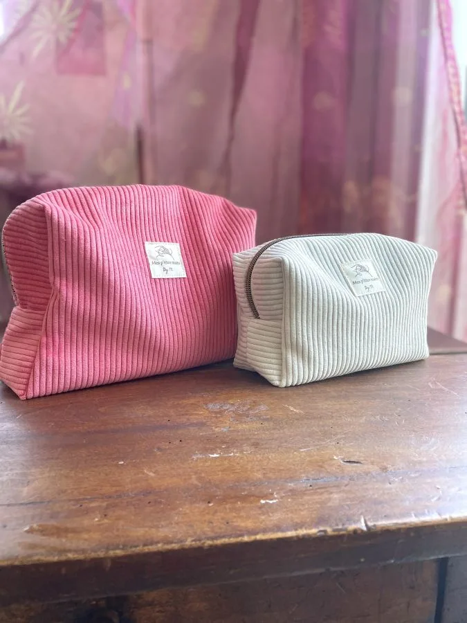 Choisissez la couleur de votre trousse et composez vous-même votre trousse de toilette en velours côtelé.