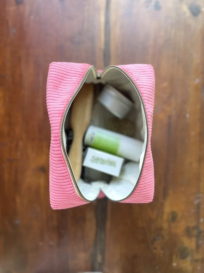 Découvrez cette jolie trousse de toilette personnalisable en velours côtelé. Avec son grand format, cette trousse vous accompagnera lors de vos week-end et vacances pour emporter partout vos essentiels.