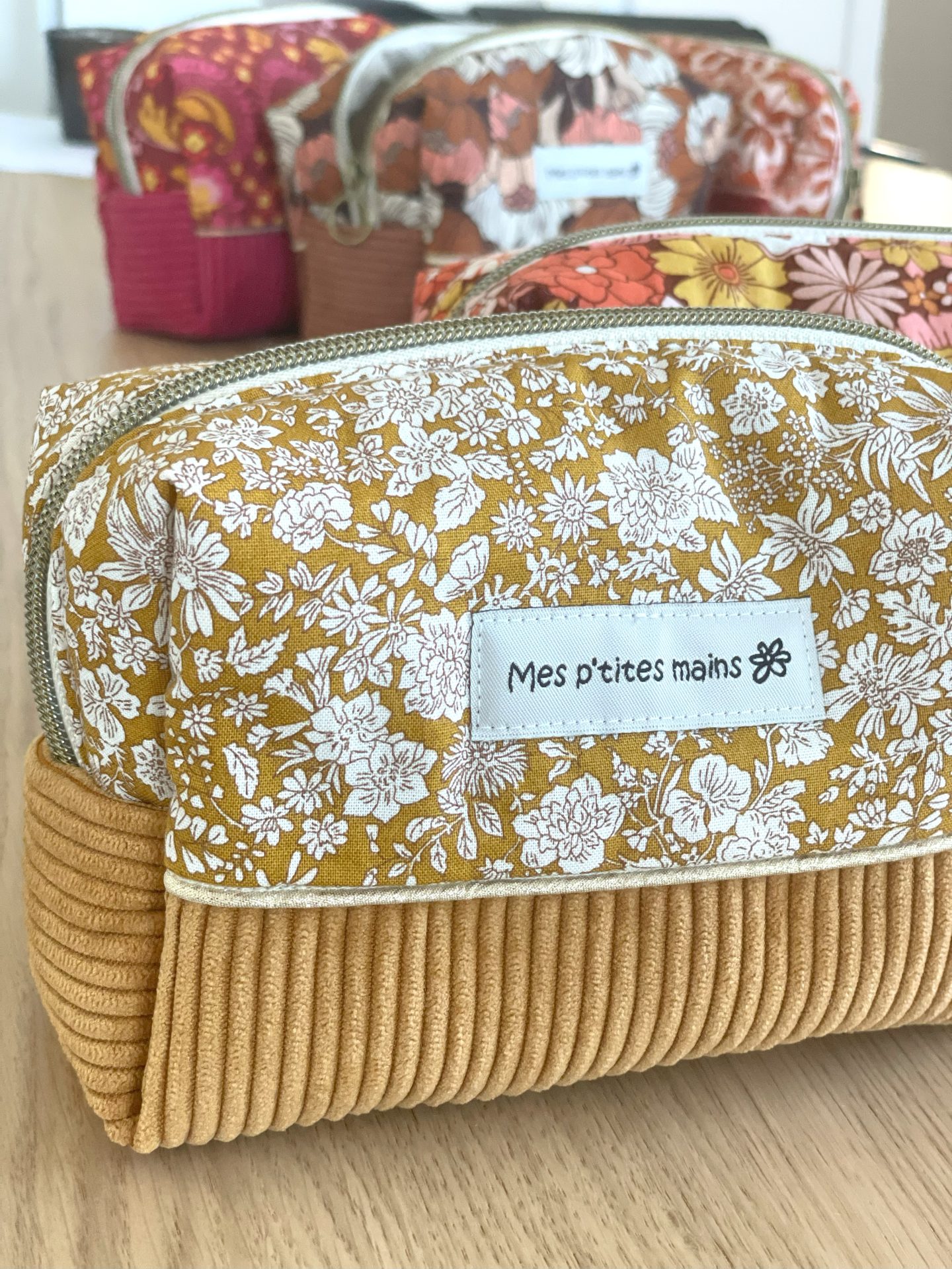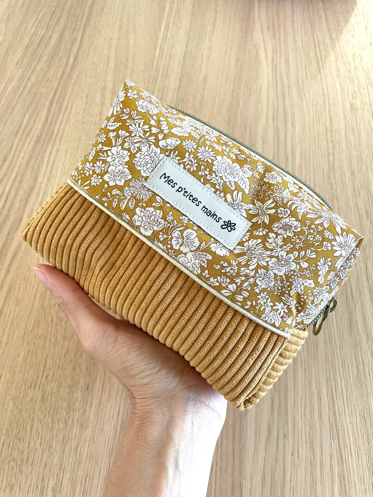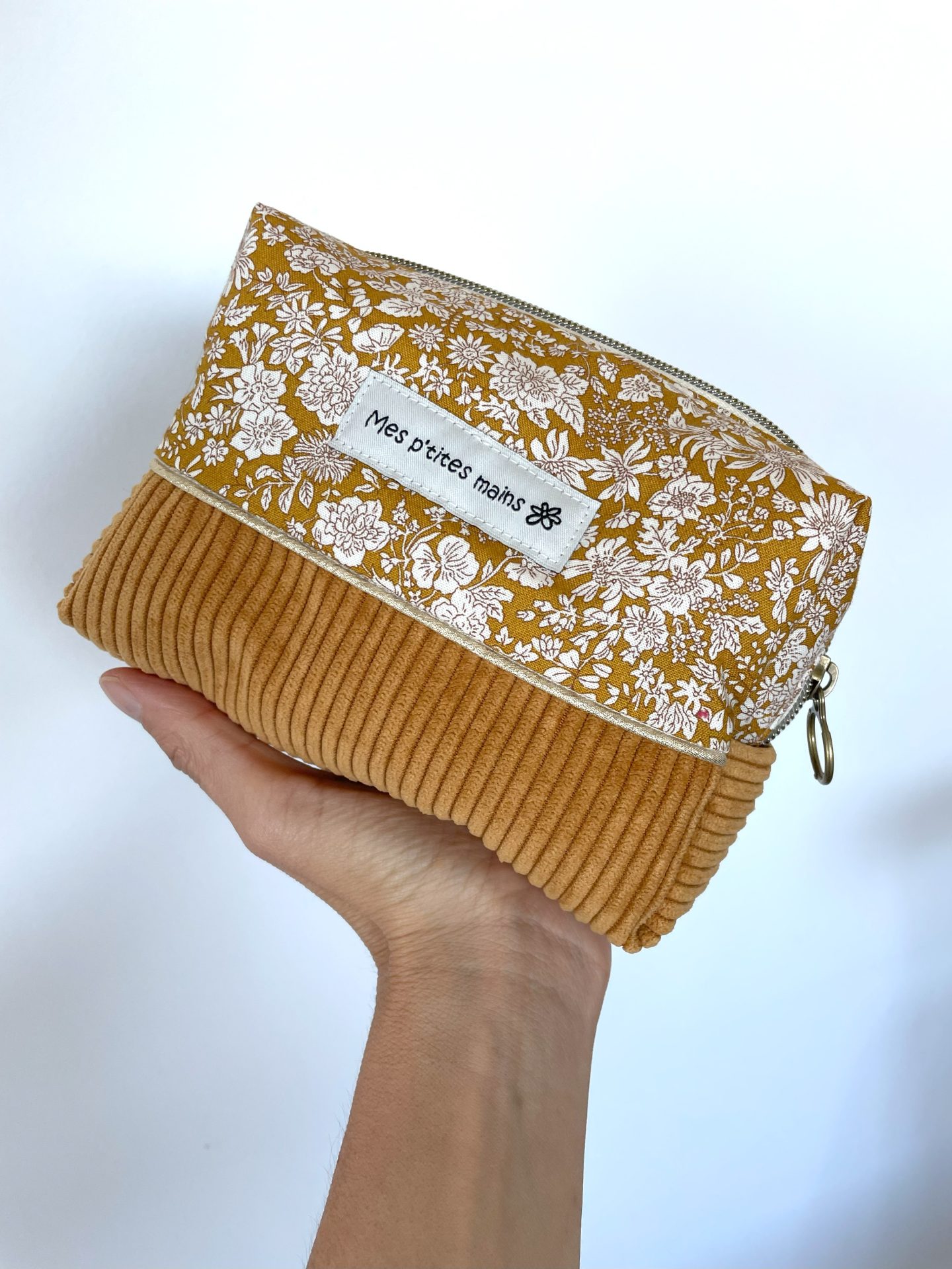 Une jolie trousse Liberty et velours côtelé ocre pouvant servir de trousse de voyage pour le maquillage ou les produits de beauté.