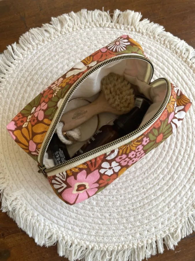 Un passepoil doré souligne l’assemblage du velours terracotta et du coton fleuri dans les tons orangés et kaki et apporte finesse et élégance à cette trousse beauté.