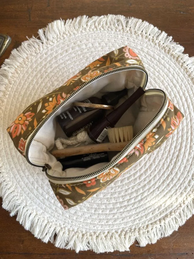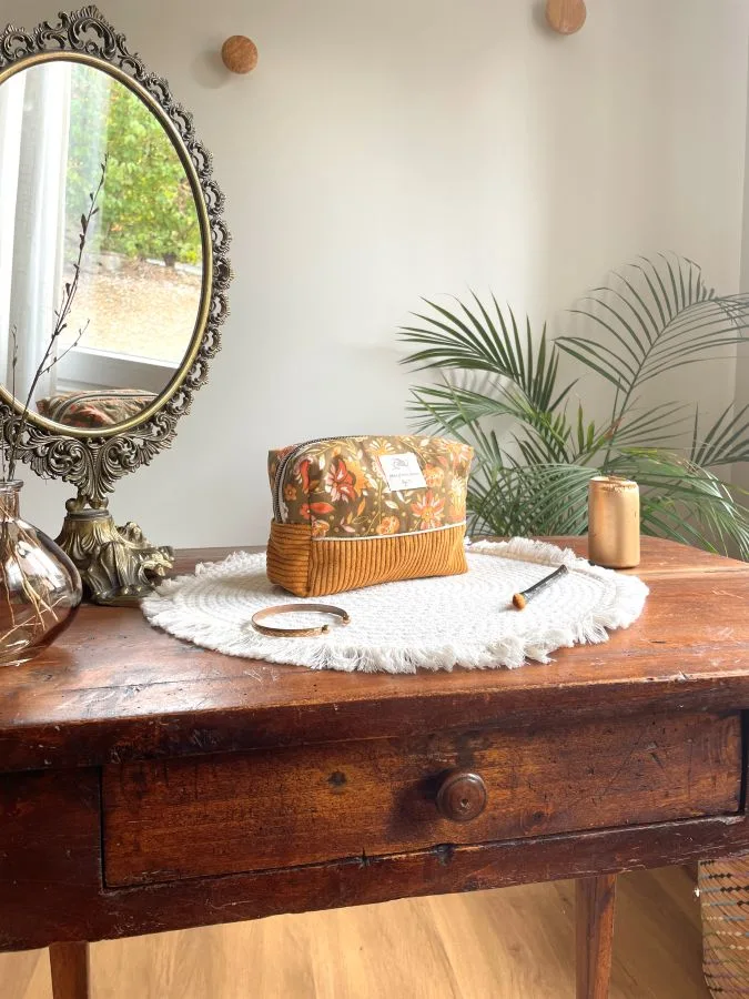 Un passepoil doré souligne l’assemblage du velours ocre et du coton dans les tons orangés et apporte finesse et élégance à cette trousse beauté.